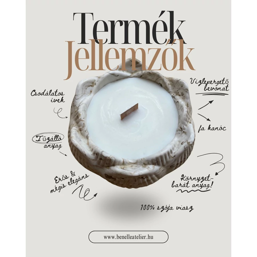 A Benelle tárgyak nem gyári tömegtermékek – minden öntés, márványminta és gyertya egyedi. Emiatt kisebb eltérések előfordulhatnak a fotókon látottakhoz képest. Ezek nem hibák, hanem a kézműves jelleg szépségei, az egyediség karakterei.