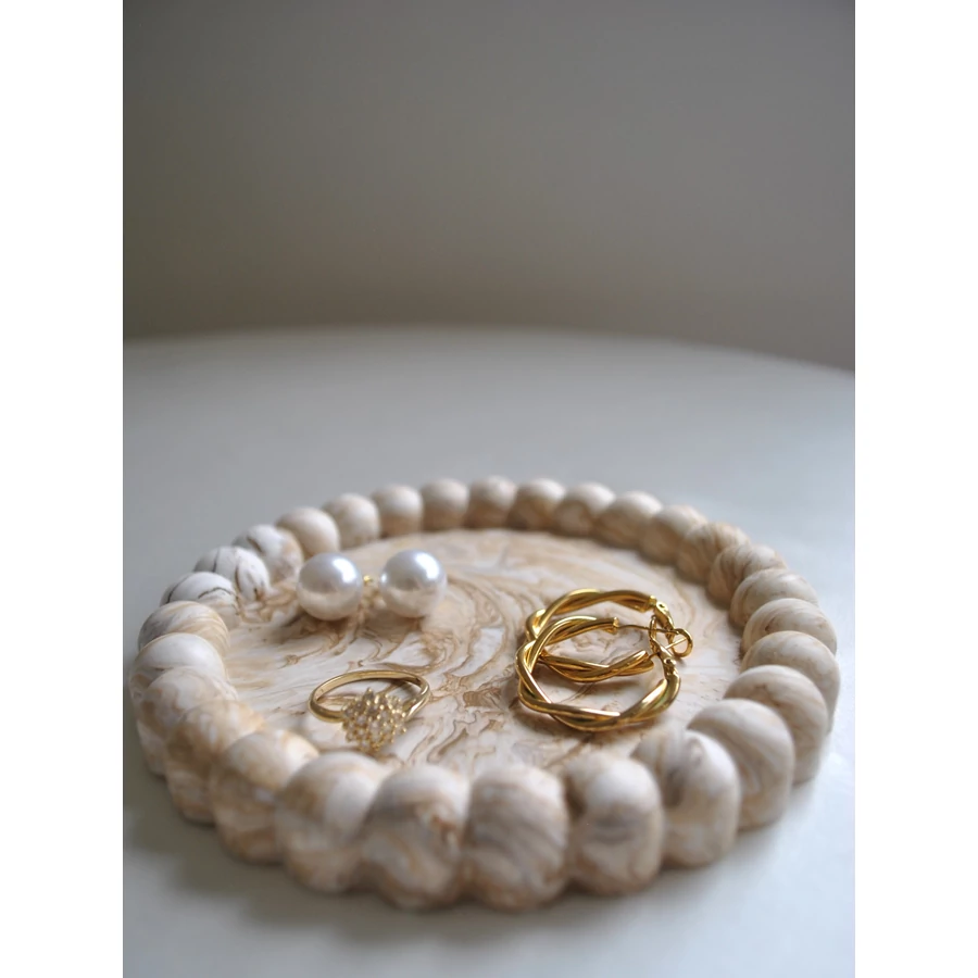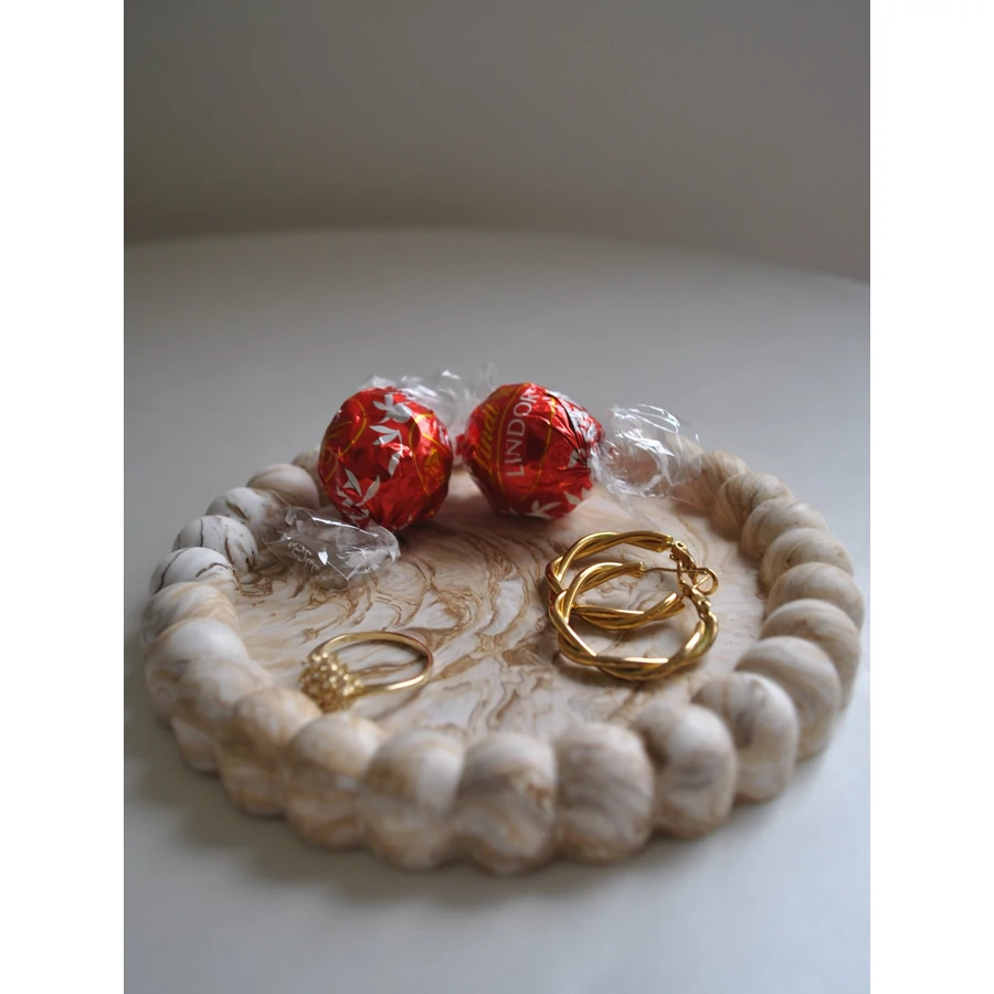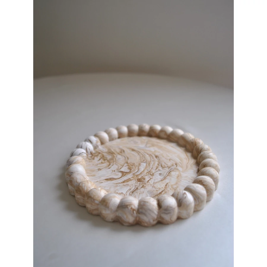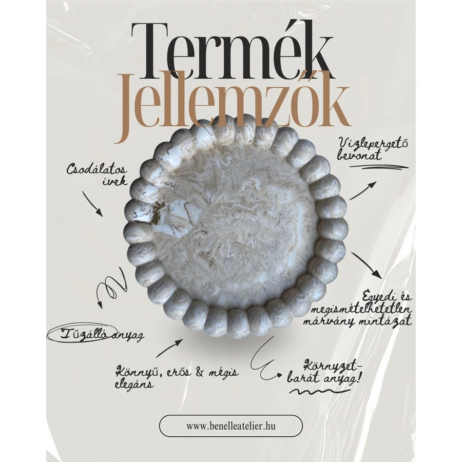Ez a kézzel készült dekoratív tálca egyszerre praktikus és szép. Használhatod asztaldíszként, vagy kisebb tárgyak - például ékszerek, kulcsok vagy csomagolt/száraz édességek - tárolására. Bármelyik polcnak vagy asztalnak ízléses kiegészítője lesz. Akár gyertya alátétnek is használhatod.