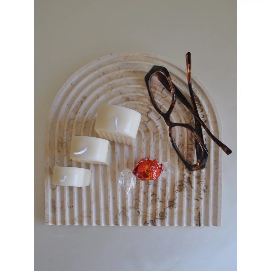 Ez a kézzel készült dekoratív tálca egyszerre praktikus és szép. Használhatod asztaldíszként, vagy kisebb tárgyak - például ékszerek, kulcsok vagy csomagolt/száraz édességek - tárolására. Bármelyik polcnak vagy asztalnak ízléses kiegészítője lesz. Akár gyertya alátétnek is használhatod.