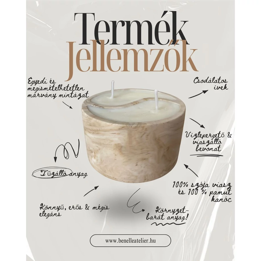 A Benelle tárgyak nem gyári tömegtermékek – minden öntés, márványminta és gyertya egyedi. Emiatt kisebb eltérések előfordulhatnak a fotókon látottakhoz képest. Ezek nem hibák, hanem a kézműves jelleg szépségei, az egyediség karakterei.